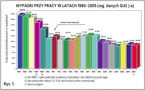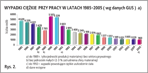 84 402 osoby (w 2004 r. – 87 050) poszkodowane w wypadkach przy pracy (bez rolnictwa indywidualnego) – co stanowi spadek liczby poszkodowanych o 3,0% w stosunku do roku poprzedniego (rys. 1.). Wypadkom ciężkim uległo 960 osób (w 2004 r. – 1 029), tj. o 6,7% mniej niż w roku poprzednim (rys. 2.). Wypadki przy pracy spowodowały śmierć 470 osób (w 2004 r. – 490), tj. o 4,1% mniej niż w 2004 r. (rys. 3.)
