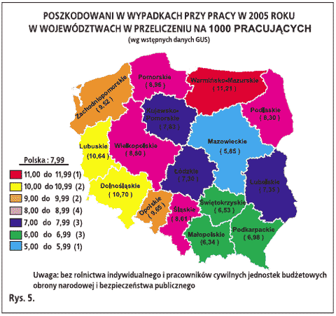 Sprawozdanie GUS o warunkach pracy za rok 2005 uwzględnia informację dotyczącą przeprowadzonej przez zakłady pracy oceny ryzyka zawodowego na stanowiskach pracy, co wynika z art. 226 pkt 1 Kodeksu pracy, par. 39 ust 1 rozporządzenia ministra pracy i polityki socjalnej z dnia 26 września 1997 r. w sprawie ogólnych przepisach bezpieczeństwa i higieny pracy (t. jedn. Dz.U. z 2003 r. nr 169, poz.1650), a także zalecanej normy PN-N-18002:2000 Systemy zarządzania bezpieczeństwem i higieną pracy. Ogólne wytyczne do oceny ryzyka zawodowego. Z badania wynika, że ocenę ryzyka zawodowego przeprowadzono na 610,9 tys. stanowisk pracy, na których było zatrudnionych 2 049,0 tys. osób (w 2004 r. odpowiednio – 557,4 i 1 952,5). Wyeliminowano lub ograniczono ryzyko zawodowe na 259,4 tys. stanowisk pracy, na których było zatrudnionych 793,0 tys. osób (w 2004 r. odpowiednio – 194,9 i 663,0).