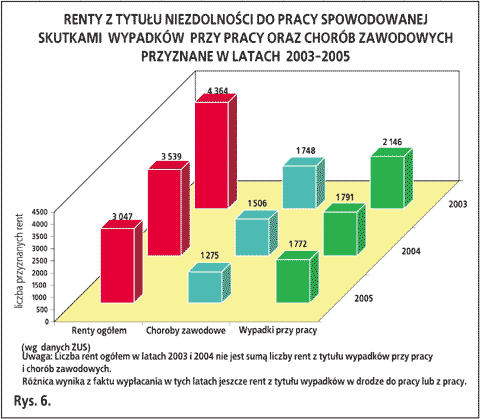 Według informacji Zakładu Ubezpieczeń Społecznych w 2005 r. przyznano 1 275 rent z tytułu niezdolności do pracy spowodowanej skutkami chorób zawodowych, tj. o 15,3% mniej niż w roku poprzednim (w 2004 r. – 1 506), w tym w 19 przypadkach orzeczono renty z tytułu całkowitej niezdolności do pracy i samodzielnej egzystencji (w 2004 r. – 19), a w 81 przypadkach – renty z tytułu całkowitej niezdolności do pracy (w 2004 r. – 86), (rys. 6.).