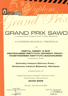 Grand Prix SAWO 2008 przyznane przez Ministra Pracy i Polityki Społecznej w kategorii edukacja i prewencja za PORTAL WIEDZY O BHP