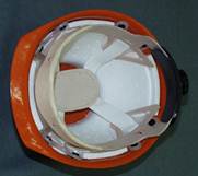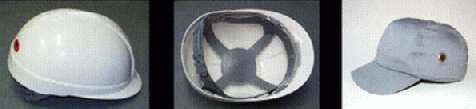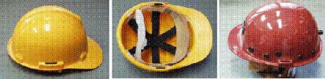 Przemysłowy hełm ochronny zabezpiecza pracownika jeżeli jest on zagrożony przez spadające przedmioty, które mogą uderzając w część ciemieniową głowy spowodować np. poważne uszkodzenia czaszki, mózgu lub kręgów szyi. Spełnia on wymagania normy PN-EN 397:1997. Przykładowe konstrukcje takich hełmów przedstawiono na rys. 2.