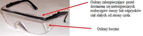 Okulary ochronne są najbardziej powszechnie stosowaną ochroną oczu. Mogą one być wyposażone w osłony zabezpieczające przed dostaniem się niebezpiecznych rozbryzgów cieczy lub odprysków ciał stałych od strony czoła i od strony bocznej. Przykładowy model okularów ochronnych przedstawiono na rys. 4.