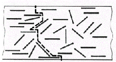 Rys. 4. Wydłużenie drogi cząsteczki substancji chemicznej przenikającej przez materiał polimerowy w wyniku obecności płytek nanonapełniaczy [8]