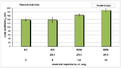 Rys. 5. Czas przebicia przez octan butylu wulkanizatów IIR zawierających różne ilości nanonapełniacza ZR-1