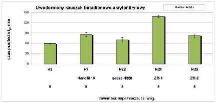 Rys. 6. Czas przebicia przez octan butylu wulkanizatów HNBR zawierających nanonapełniacze: Nanofil 15, ZR-1, ZR-2 lub napełniacz konwencjonalny sadzę N 330
