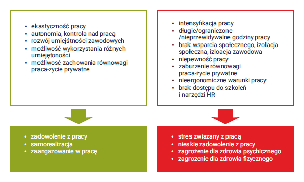 Ogólnie rzecz biorąc, takie elastyczne, niekonwencjonalne formy pracy, mogą charakteryzować się zarówno korzystnymi, jak i niekorzystnymi aspektami (rys. 1). Z perspektywy psychospołecznych warunków pracy, pozytywne cechy nowych form pracy to m.in. wysoka elastyczność, autonomia pracownicza, czy możliwość rozwoju. Z drugiej strony, niekorzystne psychospołeczne czynniki pracy dotyczą tu takich aspektów, jak np. wysoka intensywność pracy, długie lub nieprzewidywalne godziny pracy, izolacja, niepewność pracy, zaburzenie równowagi między życiem prywatnym a zawodowym.