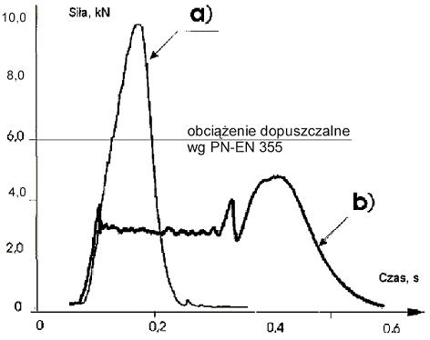 Przykładowy efekt działania amortyzatora włókienniczego w porównaniu z linką bezpieczeństwa podczas powstrzymywania spadania sztywnego obciążnika o masie 100 kg przedstawiono na rysunku 2. Wykres ten potwierdza zasadę, że sama linka bezpieczeństwa nie może być stosowana jako podzespół łącząco-amortyzujący, gdyż nie zapewnia odpowiedniego ograniczenia obciążeń dynamicznych działających na organizm człowieka.