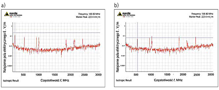 Rys. 2. Przykładowe wyniki rejestracji wartości skutecznej natężenia pola elektrycznego o częstotliwości z pasma 100 kHz - 3 GHz na stanowiskach dyspozytorów punktów alarmowania jednostek ratowniczo-gaśniczych PSP na terenie Warszawy: a) antena nadawcza radiotelefonu stacjonarnego na zewnętrznym parapecie okna pomieszczenia, w odległości ok. 2 m od stanowiska pracownika; b) antena nadawcza radiotelefonu stacjonarnego na dachu budynku jednostki