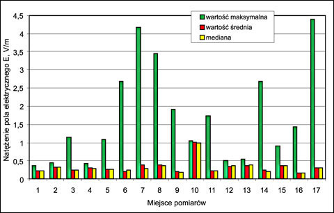 Na rys. 2. zaprezentowano przykładowe wyniki rejestracji 10-minutowych wartości skutecznej natężenia pola elektrycznego na stanowiskach dyspozytorów punktów alarmowania w czasie rutynowego wykorzystywania systemów łączności. Rejestracje wykonywano miernikiem umieszczonym na biurku dyspozytora podczas typowych warunków pracy obejmujących nadawanie i odbiór informacji przy wykorzystaniu radiotelefonów pracujących w konwencjonalnym systemie łączności (wykorzystującym częstotliwość ok. 150 MHz) oraz w trankingowym systemie łączności (wykorzystującym częstotliwość ok. 450 MHz). W trakcie rejestracji pracownicy używali również typowych telefonów komórkowych. Zestawienie wyników pomiarów odnośnie do wszystkich miejsc objętych badaniami pokazano na rys. 3.