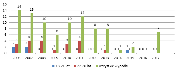 Ilość wypadków przy pracy z uwzględnieniem wieku poszkodowanych w odniesieniu do wszystkich wypadków przy pracy w latach 2006-2017