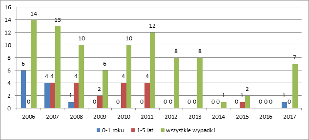 Ilość wypadków przy pracy z uwzględnieniem stażu pracy w „IPB” Sp. z o.o. w odniesieniu do wszystkich wypadków przy pracy w latach 2006-2017