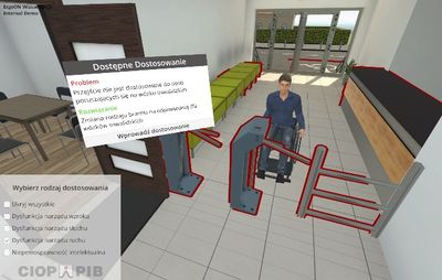 Użytkownik aplikacji będzie mógł w sposób interaktywny obejrzeć efekty typowych, najczęściej spotykanych modyfikacji stanowiska pracy do potrzeb osób z niepełnosprawnością: ruchową, narządu wzroku, narządu słuchu lub intelektualną. Aplikacja obejmuje również zagadnienia dostępu do stanowiska pracy oraz dostosowania innych pomieszczeń, z których korzystają pracownicy.