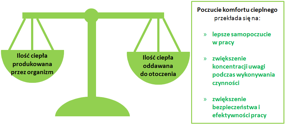 W środowisku termoneutralnym (w którym odczuwany jest komfort cieplny) ilość ciepła, które jest wytwarzane przez organizm zostaje rozproszona tak, że temperatura wnętrza ciała, bez udziału niezależnego mechanizmu termoregulacji, utrzymuje się na stałym poziomie. Poczucie komfortu cieplnego przekłada się na m.in.: lepsze samopoczucie w pracy czy też zwiększenie koncentracji uwagi podczas wykonywanych czynności (rys. 4).