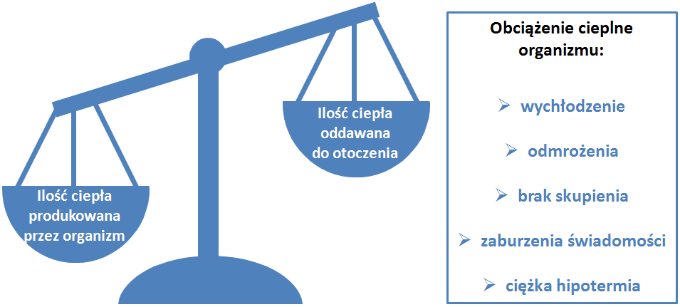 Podczas ekspozycji pracownika na środowisko zimne możliwe jest wystąpienie wychłodzenia organizmu oraz odmrożenia. Ekspozycja na środowisko zimne może powodować spadek skupienia, zaburzenia świadomości a w najgorszym przypadku może doprowadzić do ciężkiej hipotermii, a nawet śmierci (rys. 7) tempa przemian materii, a w konsekwencji pojawienie się drżenia mięśniowego [Kaciuba H. Termoregulacja. W: Fizjologia człowieka z elementami fizjologii stosowanej i klinicznej. Wydawnictwo Lekarskie PZWL, Warszawa, 2001.]).
